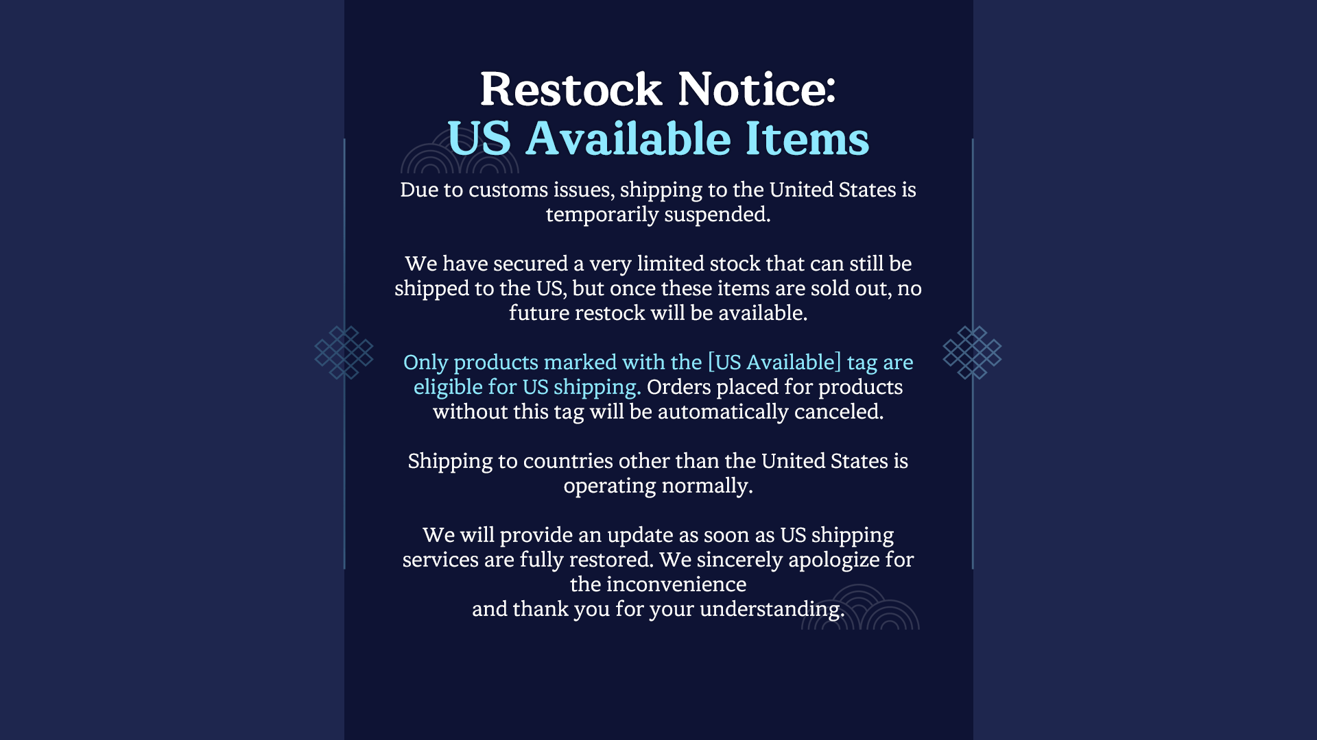 A limited selection of items is now available for shipping to the US. Future restock is not guaranteed once sold out. [US Available] items only (6 in total) can be shipped to the US.